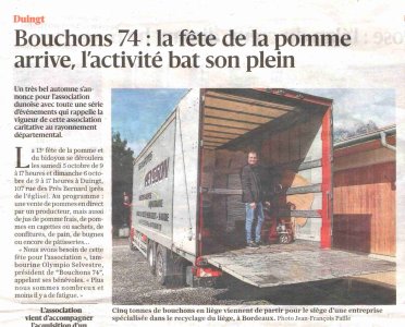 Article du Dauphiné Libéré en date du : 27/09/2024 ; Duingt ; Bouchons 74 : la fête de la pomme arrive, l’activité bat son plein