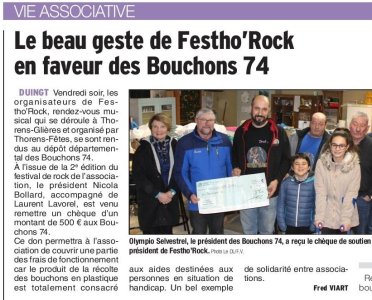 Article du Dauphiné Libéré en date du : 17/12/2018 ; le beau geste des Festho’ Rock
