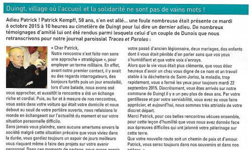 Article de la revue Traces et paroles décembre 2015 ; DUINGT village où l’accueil et la solidarité ne sont pas de vains mots !