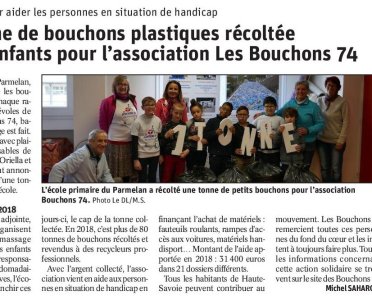 Article du Dauphiné Libéré en date du : 25/01/2020 ; PRINGY, Une tonne de bouchons plastiques récoltée par les enfants pour aider les personnes handicapées