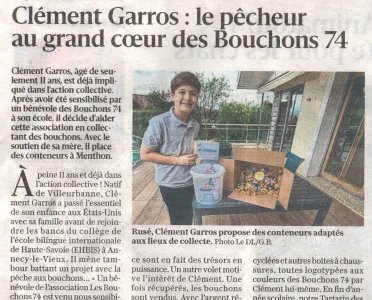 Article du Dauphiné Libéré en date du : 16/03/2024 ; Duingt ; Bouchons 74 : le joli sourire de Justine comme récompense
