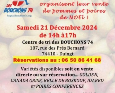Les BOUCHONS 74 organisent leur vente de fruits pommes et poires : Le samedi 21 Décembre 2024 de 14h à17h La vente aura lieu au centre de tri (…)