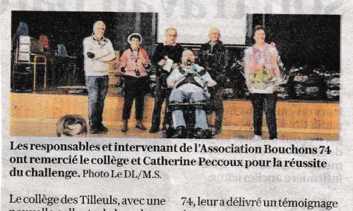 Article du Dauphiné Libéré en date du : 08/04/2020 ; DUINGT, Les Bouchons 74 continuent d’aider les personnes handicapées