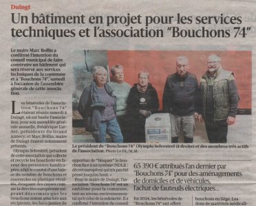 Article du Dauphiné Libéré en date du : 19/03/2025 ; Duingt : Un bâtiment en projet pour les services techniques et l’association "Bouchons 74"