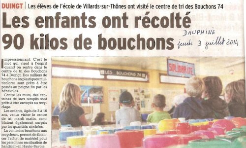 Article du Dauphiné Libéré en date du : 03/07/2014 ; VILLARDS-SUR-THÔNES, les enfants ont récoltés 90 kg de bouchons