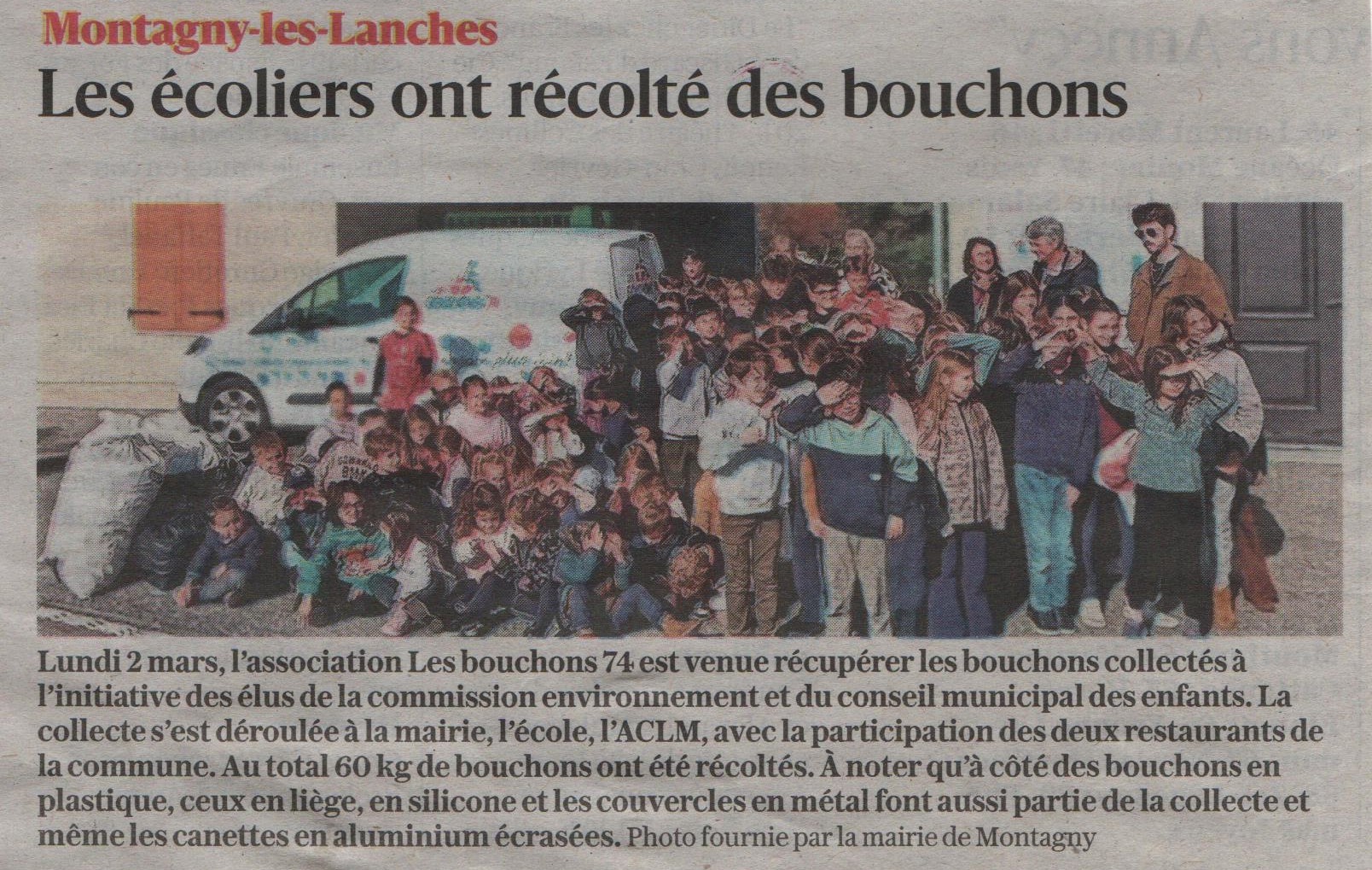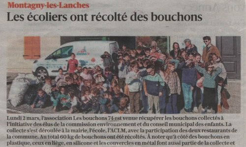 Article du Dauphiné Libéré en date du : 04/03/2026 ; Montagny-les-Lanches : Les écoliers ont récolté des bouchons