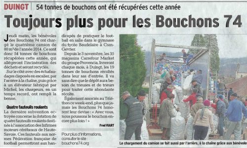 Article du Dauphiné Libéré en date du : 08/12/2014 ; DUINGT, 54 tonnes de bouchons ont été récupérées cette année. Toujours plus pour les Bouchons 74