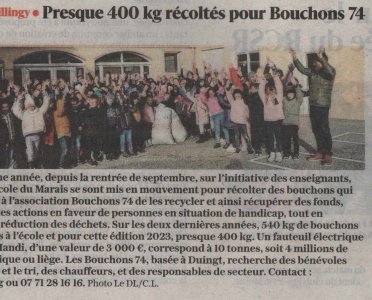 Article du Dauphiné Libéré en date du : 20/12/2023 ; La Balme de Sillingy ; Presque 400 kg récoltés pour Bouchons 74
