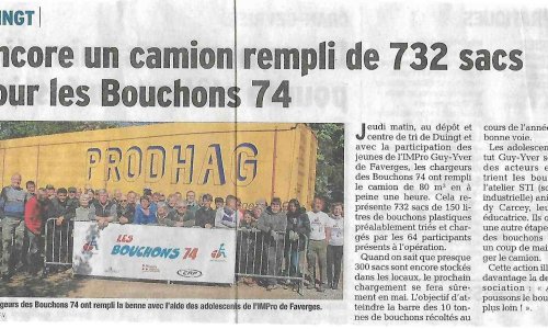 Article du Dauphiné Libéré en date du : 30/04/2016 ; DUINGT : Encore un camion rempli de 732 sacs pour les Bouchons 74