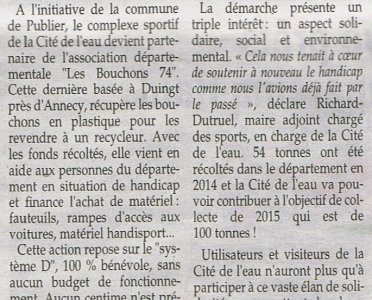 Article du Messager du 29/01/2015 ; La Cité de l’eau et les Bouchons 74 en soutien au handicap