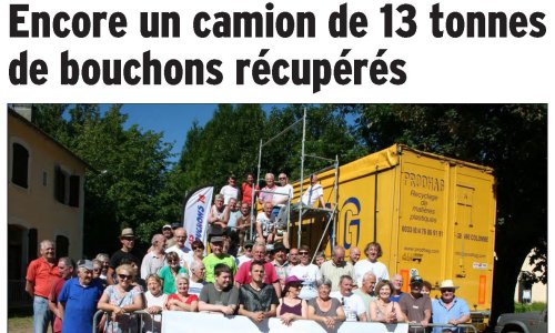 Article du Dauphiné Libéré en date du : 26/06/2016 ; DUINGT : Encore un camion de 13 tonnes de bouchons récupérés. Grâce à l’association Bouchons 74, deux personnes handicapées vont bénéficier d’une aide financières