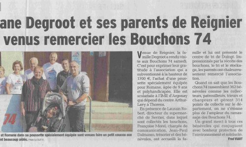 Article du Dauphiné Libéré en date du : 10/10/2016 ; DUINGT : Rmane DEGROOT et ses parents de Reignier sont venus remercier les Bouchons 74