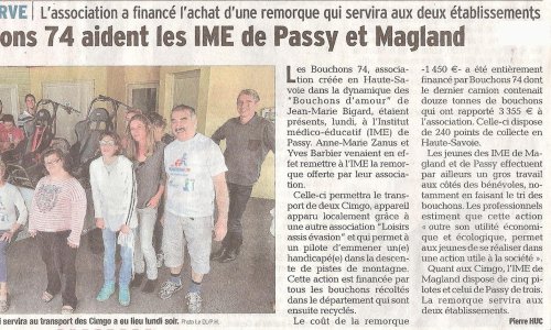 Article du Dauphiné Libéré en date du : 05/10/2016 ; VALLÉE DE L’ARVE ; Les Bouchons 74 aident les IME de Passy et Magland. L’association a financé l’achat d’une remarque qui servira aux deux établissements