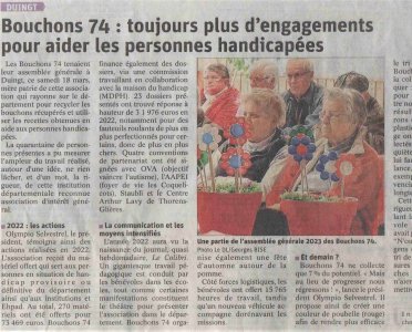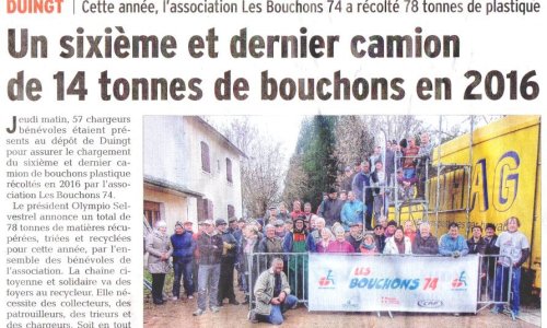 Article du Dauphiné Libéré en date du : 04/12/2016 ; DUINGT : Un sixième camion et dernier camion de 14 tonnes de bouchons en 2016. Cette année, l’association Les Bouchons 74 a récolté 78 tonnes de plastique