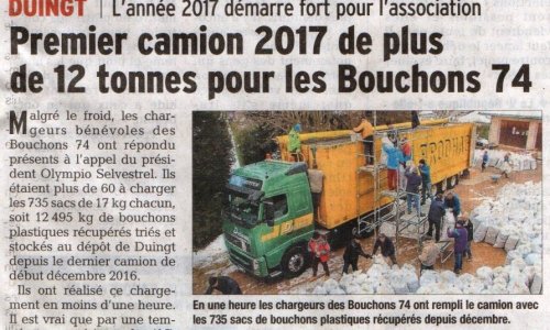 Article du Dauphiné Libéré en date du : 28/01/2017 ; DUINGT ; Premier camion 2017 de plus de 12 tonnes pour les Bouchons 74