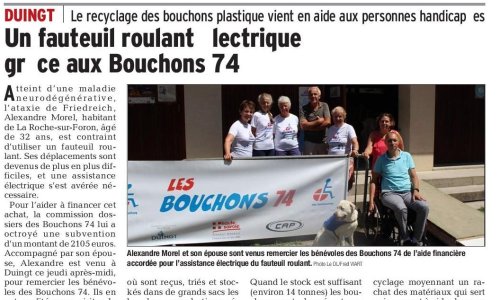 Article du Dauphiné Libéré en date du : 17/07/2017 ; DUINGT ; Un fauteuil roulant électrique grâce aux Bouchons 74. Le recyclage des bouchons plastique vient en aide aux personnes handicapées