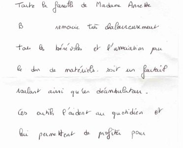 Remerciements reçus par Hélène, notre responsables dons de matériels. Cliquez sur le document, pour l’agrandir.