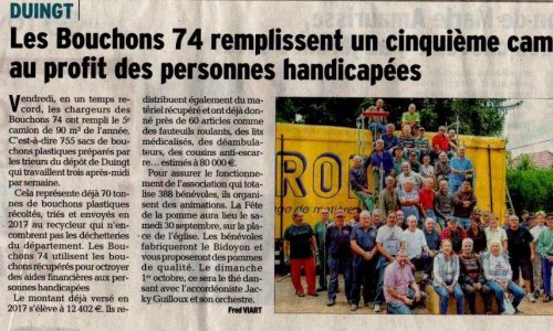 Article du Dauphiné Libéré en date du : 17/09/2017 ; DUINGT ; Les Bouchons 74 remplissent un cinquième camion au profit des personnes handicapées