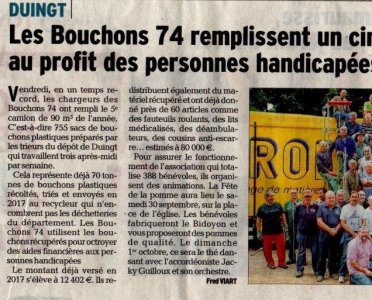 Article du Dauphiné Libéré en date du : 17/09/2017 ; DUINGT ; Les Bouchons 74 remplissent un cinquième camion au profit des personnes handicapées