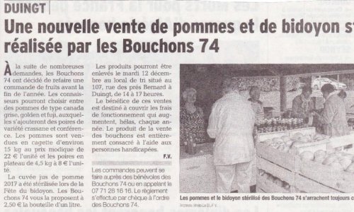 Article du Dauphiné Libéré en date du : 08/12/2017 ; DUINGT, nouvelle vente de pomme et de bidoyon pasteurisé réalisée par les Bouchons 74