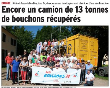 Article du Dauphiné Libéré en date du : 26/06/2016 ; DUINGT : Encore un camion de 13 tonnes de bouchons récupérés. Grâce à l’association Bouchons 74, deux personnes handicapées vont bénéficier d’une aide financières