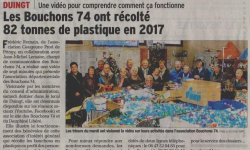 Article du Dauphiné Libéré en date du : 21/12/2017 ; DUINGT, les Bouchons 74 ont récolté 82 tonnes de plastique en 2017