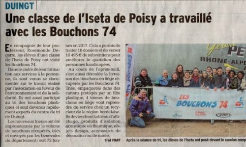Article du Dauphiné Libéré en date du : 28/02/2018 ; ne classe de l’ISETA de POISY a travaillé avec les Bouchons 74