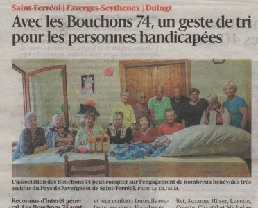 Article du Dauphiné Libéré en date du : 29/09/2023 ; Saint-Ferréol Faverges ; Avec les Bouchons74, un geste de tri pour les personnes handicapées