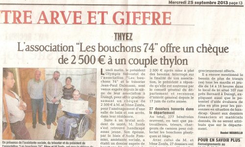 Article du Dauphiné Libéré en date du : 25 septembre 2013 ; THYEZ, L’association les Bouchons 74 offre un chèque de 2500 € à un couple thylon