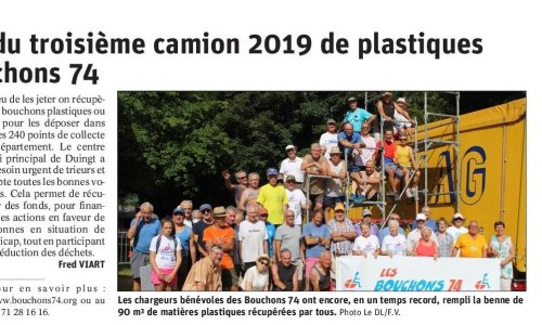 Article du Dauphiné Libéré en date du : 02/07/2019 ; DUINGT ; chargement du 3ème camion 2019 de plastiques pour les Bouchons 74