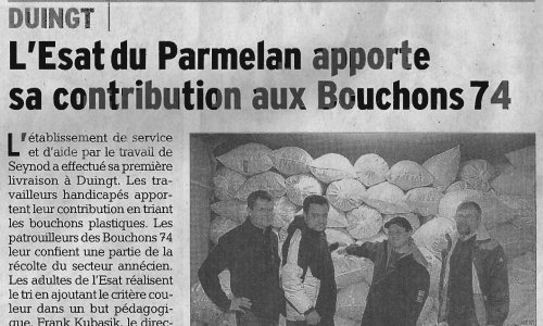 Article du Dauphiné Libéré en date du : 01 décembre 2013 ; L’ESAT du Parmelan apporte sa contribution aux Bouchons 74