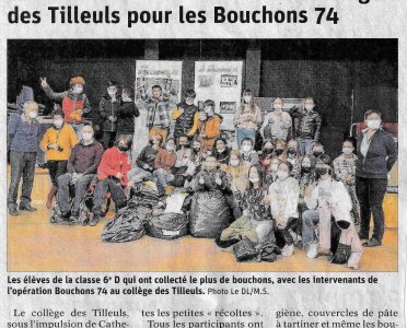 Article du Dauphiné Libéré en date du : 04/03/2022 ; ANNECY : Un beau concours solidaire au collège des Tilleuls pour les Bouchons 74