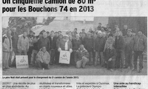 Article du Dauphiné Libéré en date du : 16 décembre 2013 ; Un 5ème camion de 80 m3 pour les Bouchons 74 en 2013