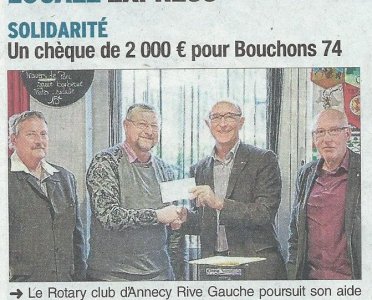 Article du Dauphiné Libéré en date du : 29/04/2016 ; Solidarité : un chèque de 2 000 € pour les Bouchons 74