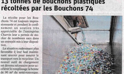 Article du Dauphiné Libéré en date du : 04/12/2016 ; DUINGT : Un sixième camion et dernier camion de 14 tonnes de bouchons en 2016. Cette année, l’association Les Bouchons 74 a récolté 78 tonnes de plastique