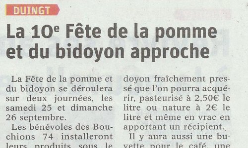 Article du Dauphiné Libéré en date du : 20/09/2021 ; DUINGT : La 10ème Fête de la pomme et du bidoyon approche