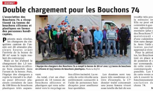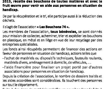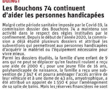 Article du Dauphiné Libéré en date du : 08/04/2020 ; DUINGT, Les Bouchons 74 continuent d’aider les personnes handicapées