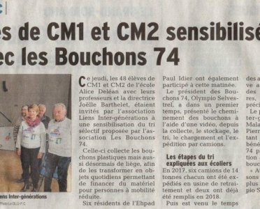 Article du Dauphiné Libéré en date du : 31/03/2018 ; VEYRIER DU LAC, les élèves de CM1 et CM2 sensibilisés au tri avec les Bouchons 74
