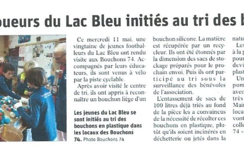 Article du Dauphiné Libéré en date du : 14/05/2022 ; DUINGT : Les jeunes joueurs du Lac Bleu initiés au tri des bouchons