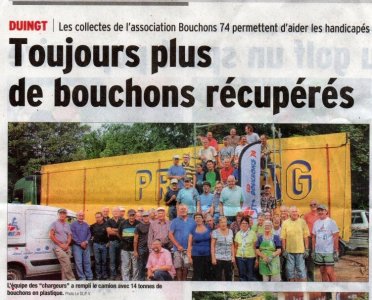 Article du Dauphiné Libéré en date du : 19/09/2016 ; DUINGT : Toujours plus de bouchons récupérés. Les collectes de l’association Bouchons 74 permettent d’aider les handicapés