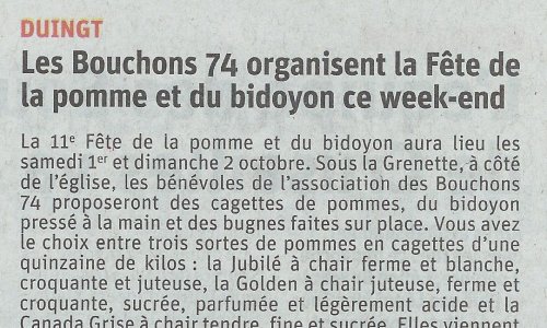 Article du Dauphiné Libéré en date du : 30/09/2022 ; DUINGT : Les Bouchons 74 organisent la Fête de la pomme et du bidoyon ce week-end