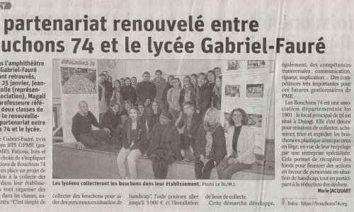 Article du Dauphiné Libéré en date du : 29/01/2023 ; ANNECY : Le partenariat renouvelé entre Bouchons 74 et le lycée Gabril-Fauré