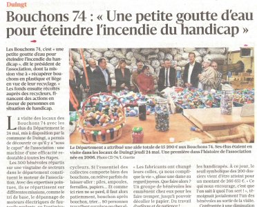 Article du Dauphiné Libéré en date du : 26/05/2024 ; DUINGT ; Bouchons 74 : <<Une petite goutte d'eau pour éteindre l'incendie du handicap>>