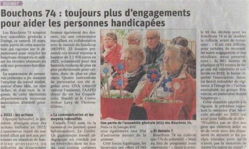 Article du Dauphiné Libéré en date du : 21/03/2023 ; DUINGT : Bouchons 74 : toujours plus d’engagements pour aider les personnes handicapées