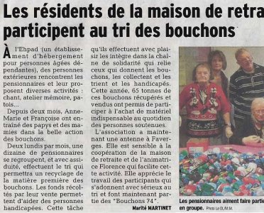 Article du Dauphiné Libéré en date du : 22 décembre 2013 ; Les résidents de la maison de retraite de FAVERGES participent au tri des bouchons