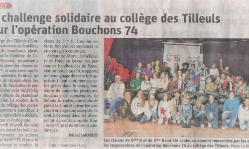 Article du Dauphiné Libéré en date du : 28/04/2023 ; ANNECY : Un challenge solidaire au collège des Tilleuls pour l’opération Bouchons 74