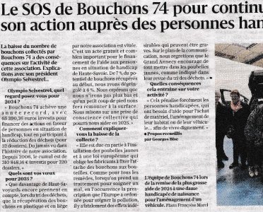 Article du Dauphiné Libéré en date du : 04/01/2025 ; Haute-Savoie : Le SOS de Bouchons 74 pour continuer san action auprès des personnes handicapées