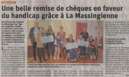 Article du Dauphiné Libéré en date du : 30/04/2023 ; MASSINGY : Une belle remise de chèques en faveur du handicap grâce à la Massingienne