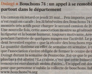 Bouchons 74 : un appel à se remobiliser partout dans le département. Cliquez sur l’article, pour l’agrandir.