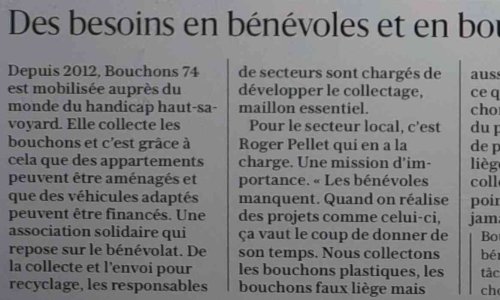 Article du Dauphiné Libéré en date du : 18/11/2023 ; La Roche sur Foron ; Des besoins en bénévoles et en bouchons !